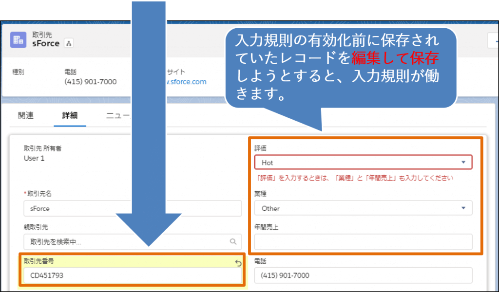 一方で、運用中のセールスフォース環境に「入力規則」を追加設定すると、過去に作成されたデータを編集した際に、「入力規則」の機能がはたらき、エラーメッセージが表示され、レコードの保存ができなくなります。