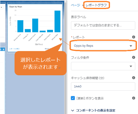 レポートグラフのプロパティでは、表示ラベルの編集や表示したいレポートの設定等が