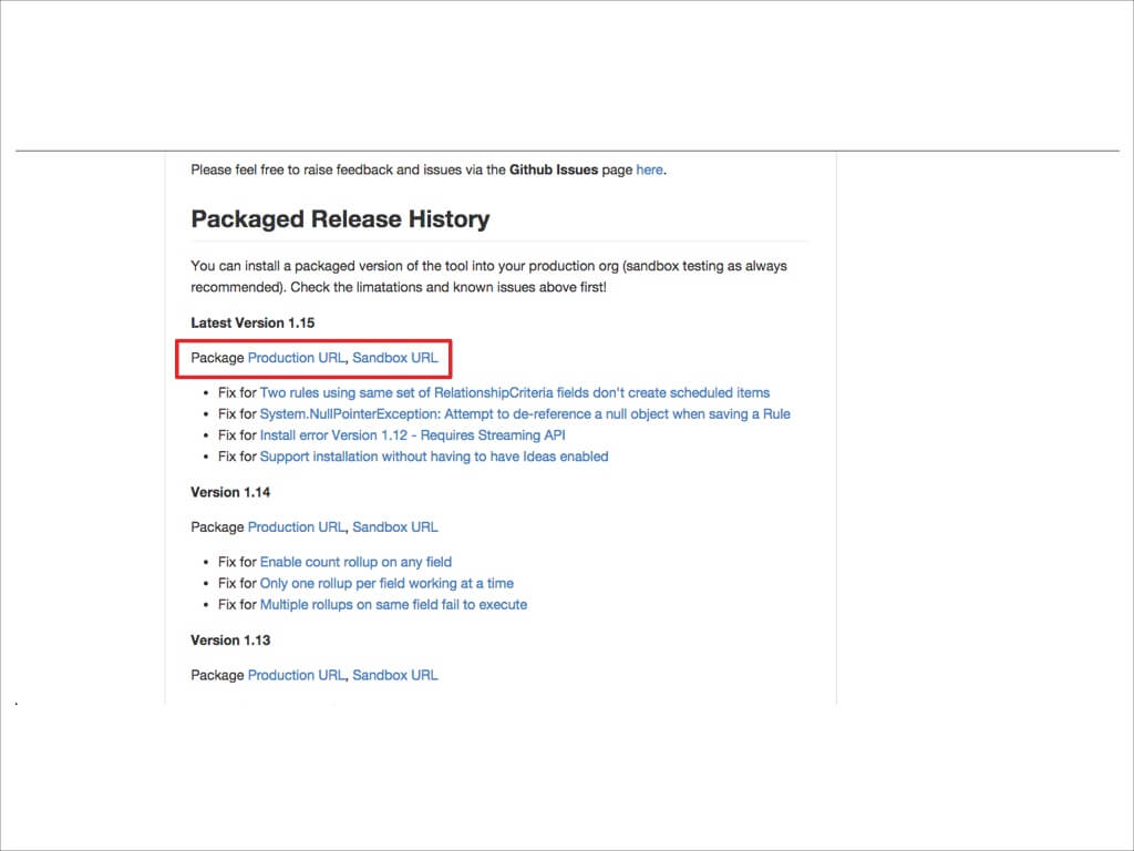 上記リンクのページ内中央付近にPackaged Release Historyというタイトルがあり、Latest Version 1.15(2014/12/21時点)の下にPackage Production URL, Sandbox URLというリンクがあります。