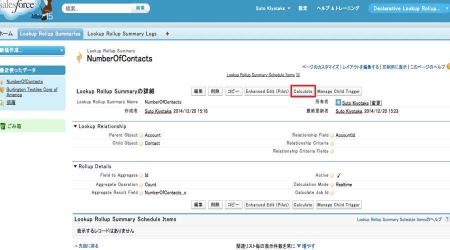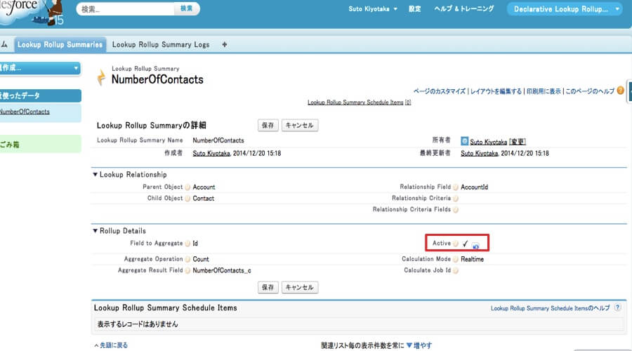 再度、「Lookup Rollup Summaries」ページを開き、「Active」チェックボックをONにして保存します。