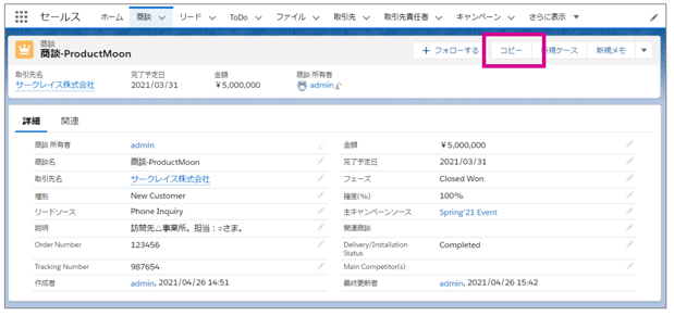 商談のレコード画面に作成した「コピー(カスタムボタン)」が表示されています。