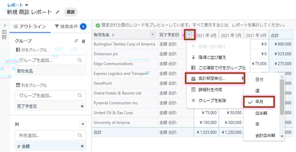 - Salesforceのレポートで、年月ごとの総計金額に占める各取引先の割合を表示させたい