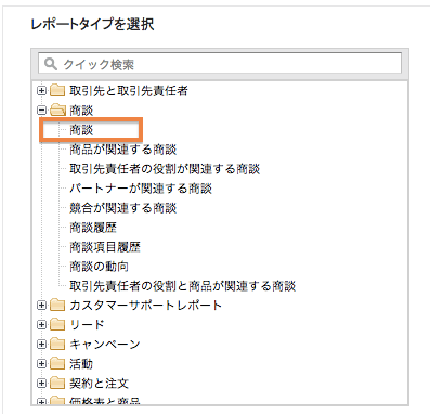 レポートで使用したいオブジェクトとレコードを選択します。今回は、商談オブジェクトのレポートを作成するので、商談 > 商談 > 作成をクリックします。