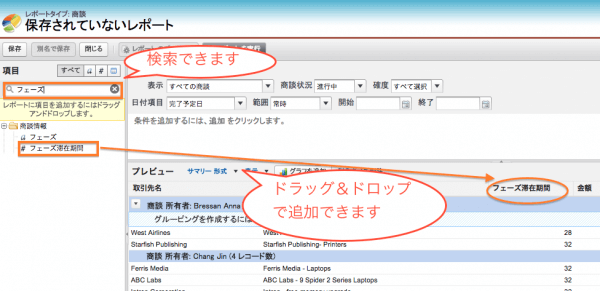 レポートに表示する項目をドラッグ&ドロップで選択します。ドラッグ&ドロップで列を並べ替えることができます。
